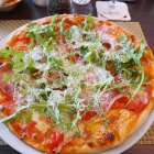 Meine Capperi gefiel mir vom Belag her gut. Der Boden war einer von der ganz dünnen Sorte, die – für mich unverständlich – immer gerne gelobt wird. Stach ich in eine Blase am Rand, so stieß ich auf ein Luftloch. Da ziehe ich die Variante mit einem wulstigen Rand aus Teig allemal vor. Mein Schwager blickte auf viele kleine Fruttiteilchen und die von ihm erbetenen, ergänzenden Kapern. Die Frutti aus der TK, was aber meist der Fall ist und womit ich kein Problem habe. Mit den Kapern prägte sich im Mund ein kräftiges Geschmackserlebnis aus, also auch gut essbar. Meine ständige Begleiterin hatte wieder ihre Lieblingspizza mit kaltem Parmaschinken und Rucola gewählt – suum cuique.