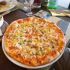 Dann dreimal Pizza (Capperi mit Sardellen, Kapern, Oliven und Peperoni für 10,50 €; Frutti di Mare für 11,00 € und Buffalo mit Mozzarella, Cocktailtomaten, Parmaschinken, Rucola und Parmesan für 12,00 €). Die Pizzen machten mit ihren 32 cm und reichlichem Belag optisch schon etwas her. Die Bepreisung der Pizzen sehe ich im oberen Drittel.