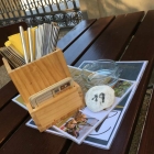 einen Aschenbecher, einen Holzständer mit Besteck und Servietten und Bierdeckel und einen Stein auf dem die Tischnummer steht.