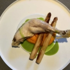 Thomas Wohlfeld beschränkt sich in seinen Gerichten in der Regel auf drei Komponenten. So auch bei der Jakobsmuschel mit Karotte und Haselnüssen. Die Jakobsmuschel weist nur dezente Röstnoten auf und fügt sich damit in den milden Charakter der Karotte als Püree und in knapp gegarten Scheiben. Sie ist auch noch in der Jus verarbeitet, die den eigentlich Kick in diesem Gericht liefert.