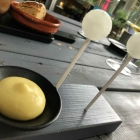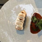 Die Kalbsbacke, von der es für jeden zwei gute Stücke gibt, ist zart, aber noch mit Biss, geschmort. Die Sauce dazu klassisch und intensiv, das Selleriepüree ohne Schnickschnack geschmacklich ganz geradeaus. Einen schönen Kick geben die Parmesan-Tortelloni mit cremiger Füllung und das Kräuteröl, das fast einen Gremolata-artigen Charakter hat. Es wird zusätzlich über das Fleisch gegeben und liefert einen fülligen Touch zum Gericht.