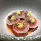 Die Brust wird auf der Haut gebraten, bis sie eine schöne Bräunung bekommen hat. Währenddessen wird das Kartoffelpüree im Beutel und die Hühnerjus im Topf erwärmt. Auch beim Püree kommen Assoziationen an einen Klassiker von Joel Robuchon auf, denn es hat einen ausgesprochen buttrigen Charakter. Dekoriert wird mit fermentierten Radieschen, die eine gewisse Frische und Säure in das Gericht bringen. Die Jus ist, ähnlich wie beim Morcheltee vorher, extrem konzentriert und zeugt von viel Zeit, die sie zum Einkochen bekommen hat. Auch dieser Teller begeistert rundweg.