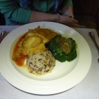 Meine Partnerin nahm heute die Zucchinischeiben in Ei-Käse-Hülle (9,90 Euro) mit Wildreis und Broccoli. Ich bin ja nicht so sehr ein Liebhaber von vegetarischen Gerichten, doch das hätte mir auch geschmeckt. Die Zucchini waren noch leicht bißfest und die Ei-Käse-Hülle ließ die Geschmacksknospen im Mund Purzelbäume schlagen. Wildreis und Broccoli waren perfekt gegart und wirkten durch die Tomatensoße keineswegs trocken.