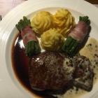 und für mich das Rumpsteak mit zwei verschiedenen Pfeffersaucen, Bohnen und Herzoginkartoffeln (EUR 19,80).