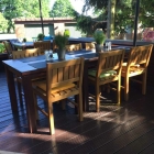 Wenn der Gast auf den Parkplatz fährt, kann er sich niicht vorstellen, was sich hinter den Mauern der Gebäude befindet. Wenn der Gast die Tür zum Restaurant öffnet, befindet sich gleich links eine Theke mit einer beeindruckenden blauen Beleuchtung. Die Bestuhlung im Restaurant ist ausgesprochen elegant. In einem der Speiseräume befindet sich eine Lounge-Ecke mit einem modernen weißen Kaminofen und einer kleinen Bibliothek. Die dezente Tischmusik passt hervorragend zum Ambiente. Geht der Gast durch das Restaurant erreicht er die Terrasse, die mit Holzdielen belegt ist und mit den dunklen Holzmöbeln ausgestattet ist, was für eine besondere Atmosphäre sorgt. Auf den Tischen lagen Kunststoff-Sets und Bestecketuis. Des weiteren standen auf den Tischen Zinkeimer mit verschiedenen Gewürzpflanzen sowie Salz- und Pfefferstreuer. Auf der Brüstung des Terrassengeländers standen farbige Laternen. Wenn der Gast die Stufen der höhergelegenen Terrasse nach unten geht, stehen dort große Schirme unter den riesigen Bäume, die bei Sonnen schein für ausreichend Schatten sorgen. Ein Bogen mit der Aufschrift "Biergarten" lädt zum verweilen und einem frisch gezapften Bier ein.