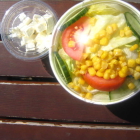 Vom Geschmack des Salates möchte ich kaum berichten. Der Inhalt der Pappbox bestand zu 90% aus faden Salatblättern und zu 10% aus Maiskörnern und 2 vollkommen geschmacksneutralen Tomatenachteln und 3 Gurkenscheiben. Nur der „Balkankäse“ (was soll das denn sein??) war durch die Salzlake, in der er schwamm, halbwegs geniessbar. Eine wirkliche Katastrophe. Hierfür 6,90 Euro zu verlangen, sind etwa 6,90 Euro zu viel. Das sah mir kolossal nach seelenloser Massenabfertigung aus – ohne jeglicher gastronomischer Ambition und irgendeinem Grundengagement. Die Jünglinge hinterm Tresen dafür verantwortlich zu machen, erschien mir ungeeignet. Also mümmelte ich mich angestrengt durch das Grünzeug und genoss dafür die Sonne (und freute mich schon auf mein Abendessen).