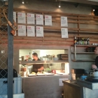 Schön ist es hier. Zur linken haben wir freie Sicht in die Küche und hinter die Theke.