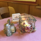 Die Tische sind eingedeckt mit rosaroten Stofftischdecken und darüber nochmal rosarote Stoffmitteldecken. Es steht ein Glas mit einer Kerze und rosaroter Verzierung auf dem Tisch, ein Ständer mit Zahnstocher, Salz-und Pfefferstreuern und ein Ständer mit Bierdeckeln