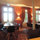 Tief hängende Spots erleuchten die mit schlichter Holzplatte versehenen, einbeinigen Bistrotische stimmig. Man sitzt auf äußerst bequem gepolsterten Schalensesseln oder gleich auf einem der lauschigen Wandsofas. Neben den Strahlern über den Tischen setzen Wandleuchten indirekte Lichtakzente. Der „geflügelte“ Kronleuchter ist natürlich Geschmackssache, fällt aber zumindest auf. Genau wie die in Rot und Senfgelb gehaltenen Nostalgievorhänge, die passend zur Retrotapete mit Blumenmuster die Fensterseite schmücken.