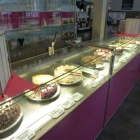Wenn man das Café betritt, fällt sofort die Kuchentheke in Auge, die ein großes Angebot von selbst gefertigten Kuchen und Torten (Stück für 3 €) zeigt.