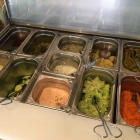 Außer der üblichen Speisekarte werden täglich 6 Tagesmenüs angeboten, die wir bereits auf dem Austeller vor der Tür studiert hatten. Daher viel uns die Auswahl nicht mehr so schwer. Zu jedem Tagesmenü gab es eine klare Suppe mit Gemüseeinlage und ein Dessert bestehend aus Beerenobstgrütze mit einem Klecks Vanillecreme. Gleich 3 Menüs wurden von uns bestellt. Das Hacksteak, Zigeuner Art, mit Pommes und Salat (7,30€). Den Rotbarsch vom Grill mit Butterkartoffeln und Salat (8,60€). Und zu guter Letzt die Schweinemedallions mit Champignonrahmsauce, Bratkartoffeln und Salat (9,60€). Den Salat gab es vom Buffet vor der Theke. Alle 3 Gerichte waren gut portioniert und schmeckten solide. Keine großen Geschmacksaromen aber auch keine Ausreißer.