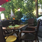 Hier gibt es einen gefliesten Bereich vorm Haus um den sich rundherum anscheinend Parkplätze befinden. Ein wenig mit kleinen Pflanzenkübeln wird kaschiert. Beschattet werden einige Tische mit Sonnenschirmen.