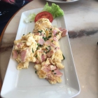 Das Rührei war schön fluffig angebraten , es gab ordentlich Schincken mit drinnen. Dieser war von einfacherer Qualität und in Stücke geschnitten. Bestreut war es noch mit frischen Schnittlauch , von würze selber konnten wir jetzt nichts raus schmecken.