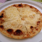 Der Mitarbeiter kam nach angenehmer Wartezeit und servierte uns das Pizzabrot. Es ist anders als erwartet und viel besser als erwartet. Eine luftig-saftige Pizze mit dem versprochenen Käse und Koblauch, richtig gut. Optimale Bräunung.