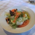 Der Beilagensalat bestand aus verschiedenen Blattsalaten die noch sehr wässrig waren und auch kein Dressing abbekommen hatten. Das Dressing befand sich auf dem darunter liegenden Krautsalat und war sehr cremig. Ein durchmischen war nicht so richtig Möglich. Sind wir wieder soweit wie es AndiH in einer anderen Kritik schon schön beschrieben hat, dann mach mal deinen Salat selber ab. Vom Krautsalat konnte man jetzt nicht mehr viel eigen Geschmack herausfiltern durch das cremige Dressing das irgendwie wie eine Cocktailsoße schmeckte, zu mindestens kam es uns so vor. Dazu gab es noch eine halbe Tomatenscheibe, Gelberübenraspel, eine rohe Gelberübenscheibe, eine schwarze Olive und eine Peperoni. Die „ Deko Beilagen“ sind jetzt nicht der Rede wert, billige eingefärbte Olive, milde Peperoni und Tomate ohne Geschmack.