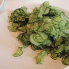 Der Fisch war bereits über Nacht in Rote-Bete-Saft im Vakuumbeutel vorbereitet worden. Aber die Haut mussten wir noch abziehen und das Filet in Streifen schneiden. Der Dip wurde frisch angerührt. Die Gurkenscheiben wurden gesalzen und dadurch dehydriert. Der Saft wurde später einfach abgedrückt.