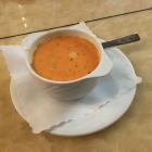 Die Linsensuppe hatte einen schönen kräftigen Geschmack, würzig mit orientalischen Gewürzen. Sie war leicht cremig und hatte aber auch noch ganze weich gekochte Linsen in sich. Sehr schön heiß und lecker.