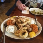 Auf der Platte war ordentlich was drauf. Zaziki wurde ja bei der Vorspeise schon beschrieben, schön fanden wir dass es in einem Schälchen war. So konnte man es runter nehmen und Platz auf der Platte schaffen. Der Reis war auf den Punkt gegart mit einer schönen Tomaten Note. Vom abschmecken her war er eher zurückhaltend gewürzt. Bei den Kalamari gab es Ringe und die Tentakel mit dazu. Leicht knusprig gegart, gut gewürzt und auf den Punkt noch zart. Bei den zwei Spießen passte der Garpunkt auch, schön saftig und zart. Wir vermuten hier das diese zusätzlich mit Kräuterbutter bestrichen worden sind. Geschmacklich einwandfrei. Die zwei Steak waren vom Schwein und diese wurden ein wenig zu lange gegrillt. Sie waren sehr durch und dadurch auch nicht mehr saftig. Vom würzen her passte es. Das Gyros lag mit frischen Zwiebelringen unter dem ganzen Haufen. Es war zum Teil schön knusprig und es gab auch weichere Stücke mit dabei. Saftig und zart und auch fein abgeschmeckt, hat uns gefallen. Es war auch nicht ganz so fein aufgeschnitten.