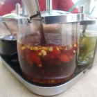 Als kleine Appetizer bestellten wir die Samosa-Teigtaschen (3,90 Euro) und die gebackenen Wan Tan (4,20 Euro), die beide mit süßsaurer Sauce ausgestattet waren. Letztere ließ sich mit dem obligatorischen Chili-Karussell (=diverse Töpfchen mit unterschiedlich scharfen, teilweise eingelegten Schoten) vom Schärfegrad her noch etwas „feintunen“. Beide Vorspeisen kamen frittiert auf die tiefen, blätterförmigen Teller, trieften aber nicht vor Fett. Die Samosa-Ecken hatten ein leicht süßliches Curryaroma, während die Wan Tan erst durch die Dipsauce an Geschmack gewannen. Aber das erwartet man auch nicht anders. Bei den mit Hähnchenfleisch gefüllten Teigtaschen steht in erster Linie ihre crunchige Textur im Vordergrund. Danach kommt erst die saftige Fleischfüllung, die – kaum hat man sie bemerkt – aufgrund der geringen Füllmenge auch schon verspeist ist.