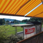 Die Terrasse ist zweckmäßig. Ja einigermaßen nett ist sie ebenfalls. Sie punktet hauptsächlich mit der schönen Gegend und natürlich den beiden Fußballplätzen auf die sie für das interessierte Publikum Einblick gewährt.