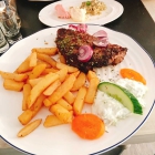 Ich hatte das gefüllte Bifteki vor mir. Es war sehr kräftig gegrillt und richtig krustig. Kräftig auch die Würzung mit Knoblauch und Kräutern und dazu der geschmolzene Schafskäse. Sehr gut! Die sehr großen Pommes hatten eine richtigen „Kartoffelbiss“. Das Tsatsiki mit eindeutiger Dill-Knoblauchnote und sahnig-cremig. Also ein richtig gelungenes Gericht.