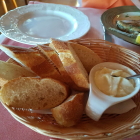 Meine Frau hatte auf eine Vorspeise verzichtet; um den gemeinsamen Salat kam sie dennoch nicht herum, der verblieb ihr zu Gänze. Dazu gab es das Brotkörbchen mit schmackhaftem Weißbrot und in einem Schüsselchen dazu eine superleckere Knoblauchcreme; früher als Gratis-Küchengruß, numehr zum Preis von EUR 3,00. Jeder Gastrobetrieb muss schauen, wie er in den für ihn beschissenen Corona-Zeiten zurecht kommt; wir sind dem "La Paella" deshalb keineswegs gram und zahlen das kleine Notopfer (wer kennt eigentich noch die Berlin-Notopfer-Briefmarke aus dem letzten Jahrhundert?) sehr gerne, wenn wir damit unserem Spanier das Überleben etwas leichter machen können.