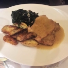 Es kommt natürlich ein Kalbsschnitzel in Zitronensauce mit belanglosen Rosmarinkartoffeln und Blattspinat, der für meine Kollegin versalzen ist (für mich, der sie mich hat probieren lassen, zumindest hart an der Grenze).
