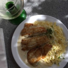 Das Angebot ist sympathisch und überzeugend günstig. Für 8,50 Euro bekommt man ein frisch gebratenes Fischfilet (z.B. Felchen, Zander, Lachsforelle) mit einer Beilage nach Wahl. Zur Auswahl stehen: gemischter Salat (grüner Blattsalat, Tomate, Mais, Karotten in einem leichten sahnigen Dressing) / hausgemachter Kartoffelsalat / Bandnudeln / Spinatnudeln / Reis. Sehr beliebt ist auch der Salat „halb und halb“ (gemischter Salat und Kartoffelsalat). Wir waren gleich an zwei aufeinanderfolgenden Tagen zu Gast und können fast alle Variationen nur loben! Feinste, frische Ware, butterzart, keine sichtbaren Gräten. Allerdings wurde mit Fett nicht gespart; was fast ein nachfolgendes Schnäpsle notwendig gemacht hätte. Der Kartoffelsalat ist würzig und sämig und schlonzig nach bester schwäbischer Manier, fast wie bei meiner Mutter. Am ersten Tag unseres Besuches wurde auch Fisch in einer Panade aus Ei und Käse angeboten – sensationell! Schmeckt leicht und fluffig. Die Größe der Fischstücke variiert, hier ist nichts vorgefertigt. Als Besonderheit kann man noch die hiesige Fischlasagne anpreisen (8,00 Euro) – mit einer wirklich leckeren, hauskreierten Sauce! Bei Getränken kann man zwischen Bier, Softdrinks, Wasser und natürlich lokalem Wein aus der Bodenseeregion auswählen. Hatte zum Abschluss auch eine Tasse Kaffee (um die 2,00 Euro).