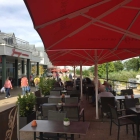 Hier, am Zugang zur Seebrücke Heringsdorf, herrscht viel Trubel. Wir finden einen freien Tisch unter einem roten Sonnenschirm.
