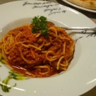 der Hammer. Geschmack wie eine 1a bzw 1 mit Sternchen, der Käse schon zerlaufen aber nicht zu dominant. Der Boden schön fluffig, knusprig, ohne abzubrechen; der Rand etwas dicker und mit Luftblasen. Das Tomatensugo fein gewürzt, herrlich. Meine Spaghetti kamen dann auch nach italienischer Art an den Tisch heißt: 2/3 der Sauce in die Spaghetti vermengt und 1/3 oben drüber, ich mag diese kleinen Mosaiksteinchen, meine Hobby das Essen, macht mich zu einem daueressenden Hobbykritiker :-) Als Dessert gab es in einem 60er Jahre Glas einen tollen Sambucca mit Espresso-Bohnen, der wurde aus einer goldenen Flasche ausgeschenkt.
