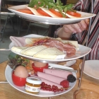 Das Gourmetfrühstück: Camembert, Honig, Gouda, Frischkäse, Edelsalami, Parma, gekochter Schinken, Obstsalat, Orangensaft oder Sekt, Tomate-Mozzarella-Pesto-Türmchen, gekochtes Ei – serviert auf einer Etagere mit drei Tellern und das Brotbüffet.