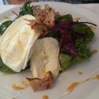 2 große Scheiben Mozzarella, cremig wie Büffelmozzarella (wenn dem so war, sollte es auf der Karte stehen), auf dem Teller meines Mannes.
