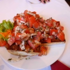 Solches Baguette bildete auch die Basis für die Bruschetta, die mit reichlich Tomaten und Zwiebeln belegt waren. Gewürzt mit Oregano waren die Bruschetta sehr saftig im Biss und gut gelungen. Besser als bei etlichen Italienern.