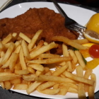 Kommen wir zu unserer Enkelin. Mittlerweile elf und Kunstturnerin wie auch Sportakrobatin kann sie auf einmal auch ordentliche Portionen verdrücken. Vorab eine Pfannkuchensuppe (3,- €), die ich leider nicht ablichten konnte. Danach ein Kinderschnitzel (7,20) mit Pommes von der Größe wie bei einem Erwachsenen. Schmeckte ihr sehr gut, die Pommes schaffte sie aber nicht mehr ganz.