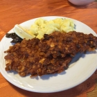 Beim Knusper Putenschnitzel gab es zwei ordentliche Stücke Fleisch drauf. Eigentlich bin ich bei Pute immer etwas skeptisch, aber das Schnitzel hier war super zart und saftig und auch durch gebraten. Vom würzen her gab es nichts zu beanstanden, sehr schöner Geschmack. Knusper Panade, noch nie gegessen, uns wurde ja bei der Empfehlung mitgeteilt, es wird mit Corn Flakes paniert. Sehr lecker, eine herrliche knuspernde Panade, klasse abgeschmeckt , super gebraten und überhaupt nicht fettig. Wir waren begeistert davon. Dazu gab es noch ein Stück Zitrone, bei der leider die Kerne nicht entfernt wurden, aber egal, wurde eh nicht gebraucht. Der Kartoffelsalat war selbst gemacht, dezent mit Schnittlauch verfeinert, leicht schlotzig und zart gewürzt. Er schmeckte jetzt nicht schlecht, wir haben ihn aber lieber mit mehr Säure und kräftiger abgeschmeckt.
