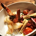 Schweinefilet aus dem Rücken würde ich sagen, zart war es, umhüllt mit Schinken und dazwischen Salbei, ganz klassisch ausgeführt in der Zubereitung, war das ein schmackhafter (Fast)Klassiker, Kalbfleisch vermisste ich hier aber nicht. Darunter ein wie erwartet unauffälliger Superfoodsalat, der aber durch den indisch inspirierten Joghurt wieder Pepp bekam. So weit, so gut, ein ordentlicher Beginn. Im Hauptgang blieb es indisch, gemischter Fisch mit gelbem Gemüse-Erbsen-Curry.