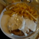Viel Soße über den beiden zarten panierten Schnitzeln, genügend Pommes, genauso wie es bei uns in der Gegend üblich ist. Unsere Ü70er waren begeistert.