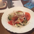Der Bauernsalat bestand aus Tomaten, Zwiebeln, Gurken und einem Stück Schafskäse. Der Schafskäse hatte einen schönen Geschmack, die Gurken frisch aufgeschnitten, genauso wie die Tomaten und Zwiebeln. Es gab ein dezentes Essig-Öl-Dressing mit dabei das sehr dezent war. Wir mussten noch etwas nachhelfen. Gut die Tomaten jetzt nicht so richtig, aber was will man um diese Zeit erwarten. Einzig was störte waren die vielen getrockneten Kräuter die darüber gestreut wurden , die „staubten“ mächtig .