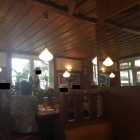 Es ist hier viel mit Holz verkleidet, die Wände zieren Bilder mit griechischen Motiven und es gibt einige Blumenstöcke im Raum.