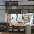 An verschiedenen Stationen kann man sich überwiegend selbst bedienen. Für ein warmes Essen gibt es 2 Möglichkeiten: Entweder man lässt sich an Station 1 eines von drei Tages-/Mittagsgerichten vom Personal zum festgesetzten Preis auf den Teller geben …