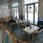 An den verschiedenen Tischen in unterschiedlichen Höhen gibt es keine einheitlichen Sitzgelegenheiten, Sessel und Couches lockern das Bild auf. Die Wände sind aus Sichtbeton, zum Teil mit Gittern verkleidet, Kupferelemente und Lampen sorgen für warmes Licht. Eine Rückwand mit Fliesenmosaik zeigt eine historische Stadtansicht.