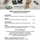 Momentan bietet man eine kleine, wöchentlich wechselnde Take-Away- und Liefer-Karte, die immer aus vier Gerichten besteht sowie einem allseits beliebten Vorspeisenteller, den man ab zwei Personen aufwärts auf den Tisch bringt, in dieser Woche gibt man sich unter dem Motto „Basti nimmt Euch mit auf Reisen“ als kulinarisches Reisebüro und gleich zwei Gerichte lachten uns sehr an: