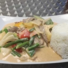 Ich bestellte jetzt mein Essen: "Curry Sauce Rot (leicht scharf) mit verschiedenen Gemüsen" mit Rindfleisch zu 7 Euro. Weil alles offen ist, kann man gut bei der Zubereitung vom Gericht zuschauen. Was mir gefallen hat, dass man das Essen auf einem schönen Porzellanteller angerichtet bekommt. Besteck (oder Stäbchen... für Könner bzw. Hungerkünstler) nimmt man sich selber von der Anrichte, Getränke aus dem Kühlschrank. Das Essen war sehr appetitlich angerichtet (ich hoffe, dass es immer so ist und nicht nur deswegen, weil ich wegen meiner Fotographiererei als Tester enttarnt wurde) und war auch sehr schmackhaft. Das Rindfleisch von guter Qualität, frisch und schön saftig (und nicht trocken). Das Gemüse knackig und frisch. Die Sauce von angenehm leichter Schärfe. Ich bin normal ein "Nachwürzer", aber die auf dem Tisch bereitstehende Chillisauce hätte den guten optisch-ästhetischen Eindruck nur vernichtet und war auch geschmacklich nicht nötig.