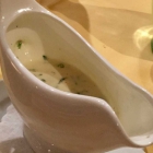 Als Beilage werden in zwei Schälchen die Kräuterkartoffeln und dazu eine Sauciere mit Kräuter-Sahne-Sauce serviert.