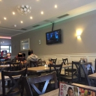 Im vorderen Bereich gibt es dunklere Stühle und helle Tisch in unterschiedlichen Größen für die Personenzahlen. An der Wand hängt ein Fernseher, der aber sehr leise eingestellt war. Dann geht es nach hinten am Tresen vorbei, da befinden sich rechter Hand die Toiletten und gerade aus einige Spielautomaten und eine Art Sitz Lounge.