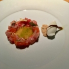 Zum nächsten Gang, dem Tatar vom Jungrind, erklärt uns Thomas Imbusch, dass das Tier durch einen Weideschuss getötet wurde, was bedingt durch den Überraschungseffekt und die gewohnte Umgebung auf der Weide keinerlei Stress für die Tiere verursacht und sich somit auch positiv auf die Fleischqualität auswirkt.
