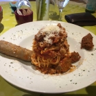 Ein Rippchen lag auch noch unter der Pasta. Auch Italiener können deftig lecker kochen, pure Landküche war das! Tomaten, Oregano, Thymian, Knoblauch bestimmten den Geschmack des Ragouts. Zum Glück hatte ich genug Hunger für diesen leckeren Sattmacher! Frage nach dem Rezept ergab, dass das ein Familienrezept aus der Heimat war. Die Salsiccia war nicht angebraten, sondern kurz mit geschmort worden, dass passte gut. Auch die Pasta war al dente serviert auf den Punkt gegart.