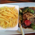 Die Kraftbrühe war mit Abstand die Beste seit langem. In den Tiefen des Porzellans hatten sich Pfannkuchenstreifen und kleingewürfeltes Suppenfleisch zu einem wohlschmeckenden Allerlei zusammengefunden. Die etwas leichteren, dünn geschnittenen Frühlingszwiebelringe schwammen dagegen obenauf. Diese Consommé hatte richtig viel Rinder-Schmackes abbekommen, was die „Königin der Fleischbrühen“ zu einer wahren Gaumenfreude machte. Sie wurde definitiv nicht mit Mamma Maggi „getuned“, sondern mit guten Grundzutaten und auch genügend Zeit zubereitet. Das schmeckte man einfach. Auch beim Beilagensalat war Frische Trumpf. Sein delikates Sauerrahmdressing lobte schon mein Kollege bei der letztjährigen Einkehr.