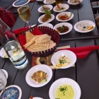 Ein Super Einstieg. Von dem dünnen, gereichten Fladenbrot dürfen wir jederzeit nachordern. Die nächste 20 Minuten erfolgt ein Probieren und reges Tauschen von Schüsselchen. Begeistert werden die erschmeckten Erfahrungen ausgetauscht. Alle sind zufrieden mit der anteiligen Investition von 3,40 €.