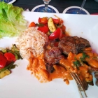 Geschmacklich haben das Grillgemüse, der Reis und die Soße in die arabische Geschmackswelt entführt. Für den Kollegen war die Soße aber definitiv zu süß.